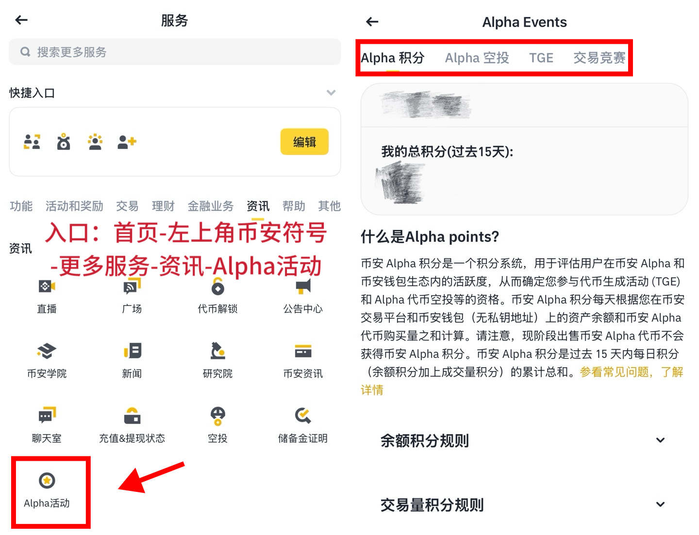 Điểm bao gồm hai phần: điểm cân bằng tài sản và điểm khối lượng giao dịch. Vào lúc 23:59:59 giờ UTC hàng ngày, ảnh chụp nhanh số dư tài sản của người dùng trong tài khoản chính Binance CEX và ví không cần chìa khóa, cũng như số lượng token Alpha đã mua trong 24 giờ qua sẽ được thực hiện để tính điểm trong ngày. Điểm được tính theo chu kỳ 15 ngày và mỗi điểm sẽ hết hạn sau 15 ngày. Các quy tắc cụ thể như sau: