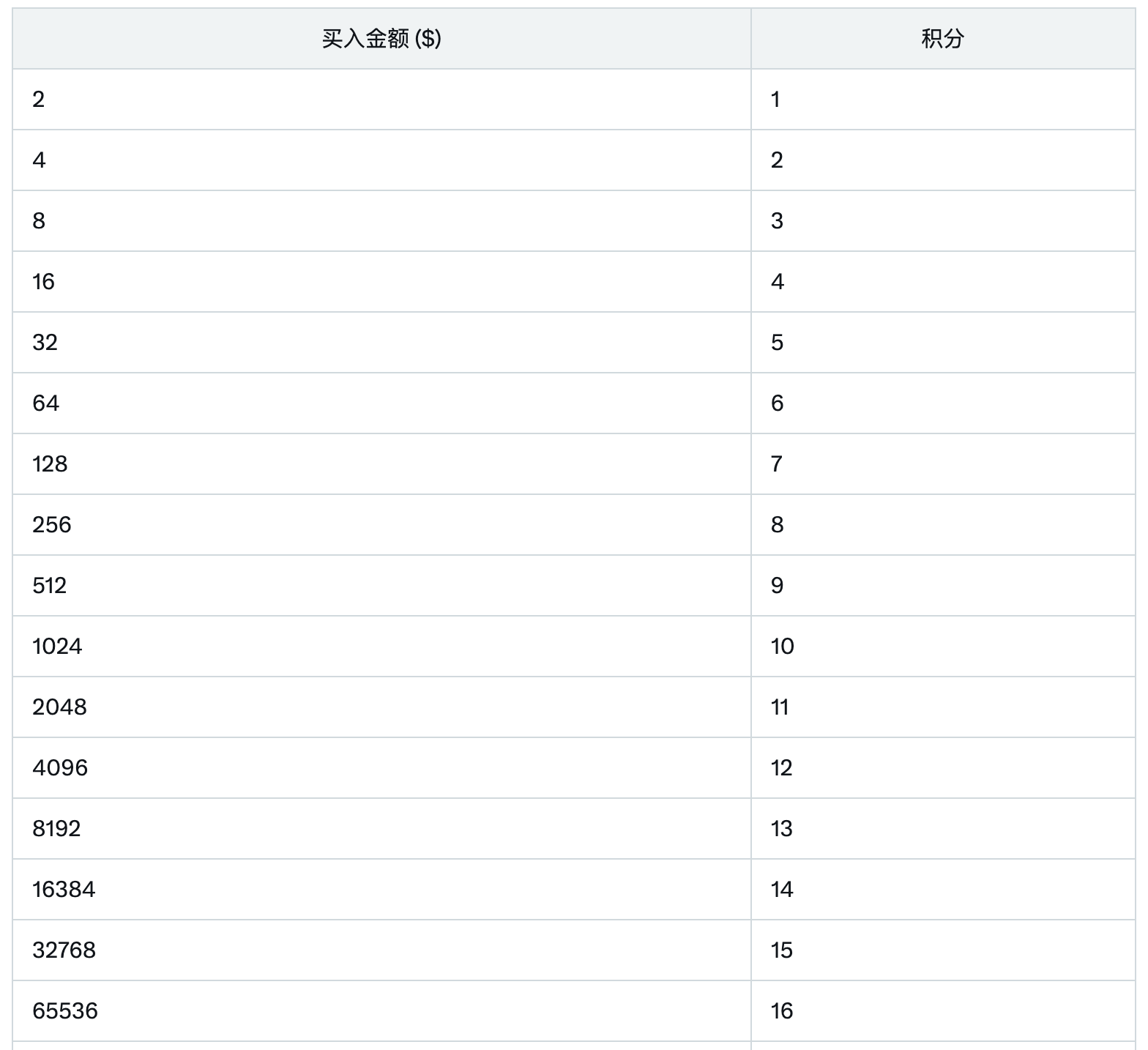 Điểm khối lượng giao dịch: Chỉ các giao dịch mua token Alpha trong ngày mới được tính vào điểm, còn giao dịch bán không được tính. Điểm sẽ tăng khi số tiền mua hàng tăng gấp đôi: 1 điểm cho lần mua hàng 2 đô la, 2 điểm cho lần mua hàng 4 đô la, 3 điểm cho lần mua hàng 8 đô la, 4 điểm cho lần mua hàng 16 đô la, 5 điểm cho lần mua hàng 32 đô la và thêm 1 điểm cho mỗi lần nhân đôi số tiền sau đó. Ví dụ, nếu bạn mua 600 đô la rồi bán 500 đô la, điểm vẫn sẽ được tính dựa trên 600 đô la.