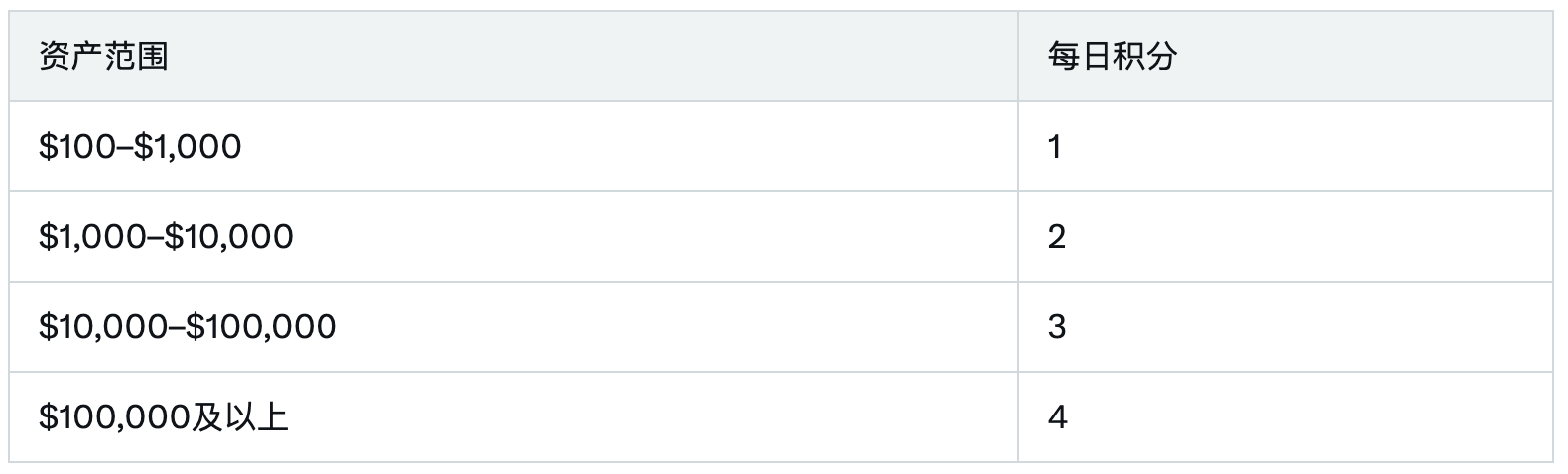 Điểm cân bằng: Đếm tổng số dư tài sản và tính điểm theo từng bậc. Ví dụ, số dư từ $100 đến $1.000 có giá trị 1 điểm mỗi ngày, từ $1.000 đến $10.000 có giá trị 2 điểm mỗi ngày, từ $10.000 đến $100.000 có giá trị 3 điểm mỗi ngày và từ ≥$100.000 có giá trị 4 điểm mỗi ngày. Số điểm cân bằng tối đa hàng ngày là 4 điểm (tương ứng với số tiền nắm giữ ≥ 100.000 đô la).