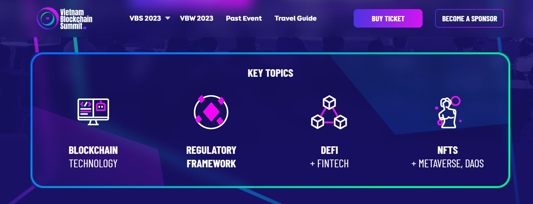 Vietnam Blockchain Summit 2023 sẽ được diễn ra trong 02 ngày 12-13/10/2023 tại Tp. Hồ Chí Minh, dự kiến sẽ thu hút trên 2,500 lượt đại biểu trực tiếp, là lãnh đạo Chính phủ, bộ, ngành, các diễn giả, chuyên gia, lãnh đạo các công ty lớn về blockchain, các doanh nghiệp ứng dụng, cơ quan truyền thông, báo chí tại Việt Nam và trên thế giới, hơn 80 diễn giả là chuyên gia, nhà quản lý, lãnh đạo tổ chức, doanh nghiệp.