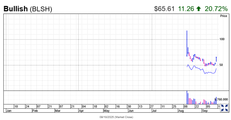 Vào thứ Năm (ngày 18 tháng 9), cổ phiếu của sàn giao dịch Bullish mới niêm yết đã tăng vọt hơn 20%, Coinbase tăng hơn 7% và công ty khai thác Bitcoin CleanSpark tăng gần 18%. Trong khi đó, giá Bitcoin tăng 1,5% lên hơn 117.500 đô la, nâng mức tăng từ đầu năm lên 26%. Thị trường nhìn chung cho rằng sự tăng vọt này là do các yếu tố như việc Cục Dự trữ Liên bang cắt giảm lãi suất và việc tuân thủ quy định được cải thiện.