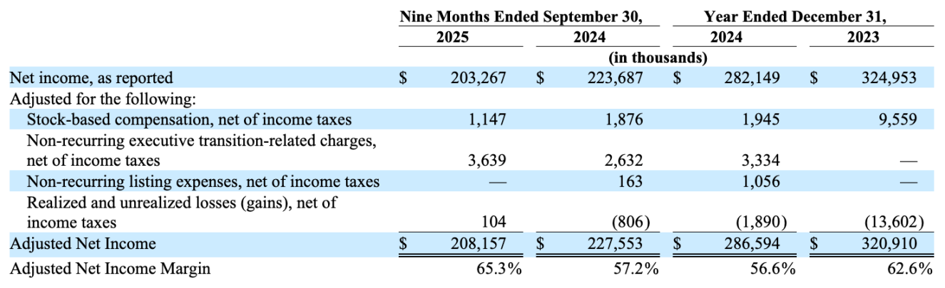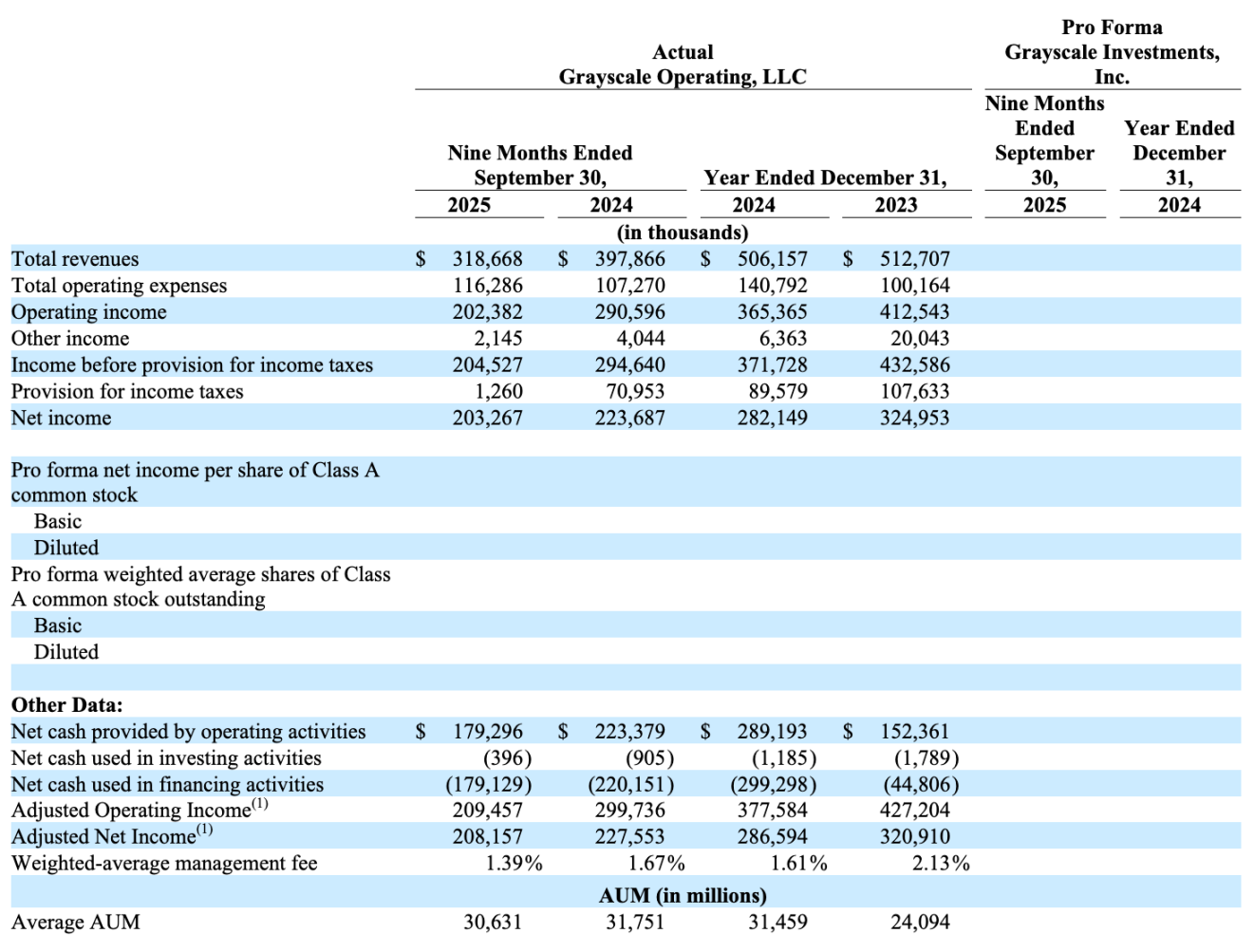 Về hiệu quả tài chính, trong chín tháng kết thúc vào ngày 30 tháng 9 năm 2025, doanh thu hoạt động của Grayscale đạt khoảng 319 triệu đô la, giảm 20% so với cùng kỳ năm trước; chi phí hoạt động đạt khoảng 116 triệu đô la, tăng 8,4% so với cùng kỳ năm trước; và lợi nhuận hoạt động đạt khoảng 202 triệu đô la, giảm 30,4% so với cùng kỳ năm trước. Lợi nhuận ròng, bao gồm các khoản thu nhập khác và không bao gồm dự phòng thuế thu nhập, đạt khoảng 203 triệu đô la, giảm 9,1% so với cùng kỳ năm trước. Hơn nữa, dữ liệu tài sản quản lý trung bình cho thấy tài sản quản lý năm nay có thể thấp hơn năm ngoái.