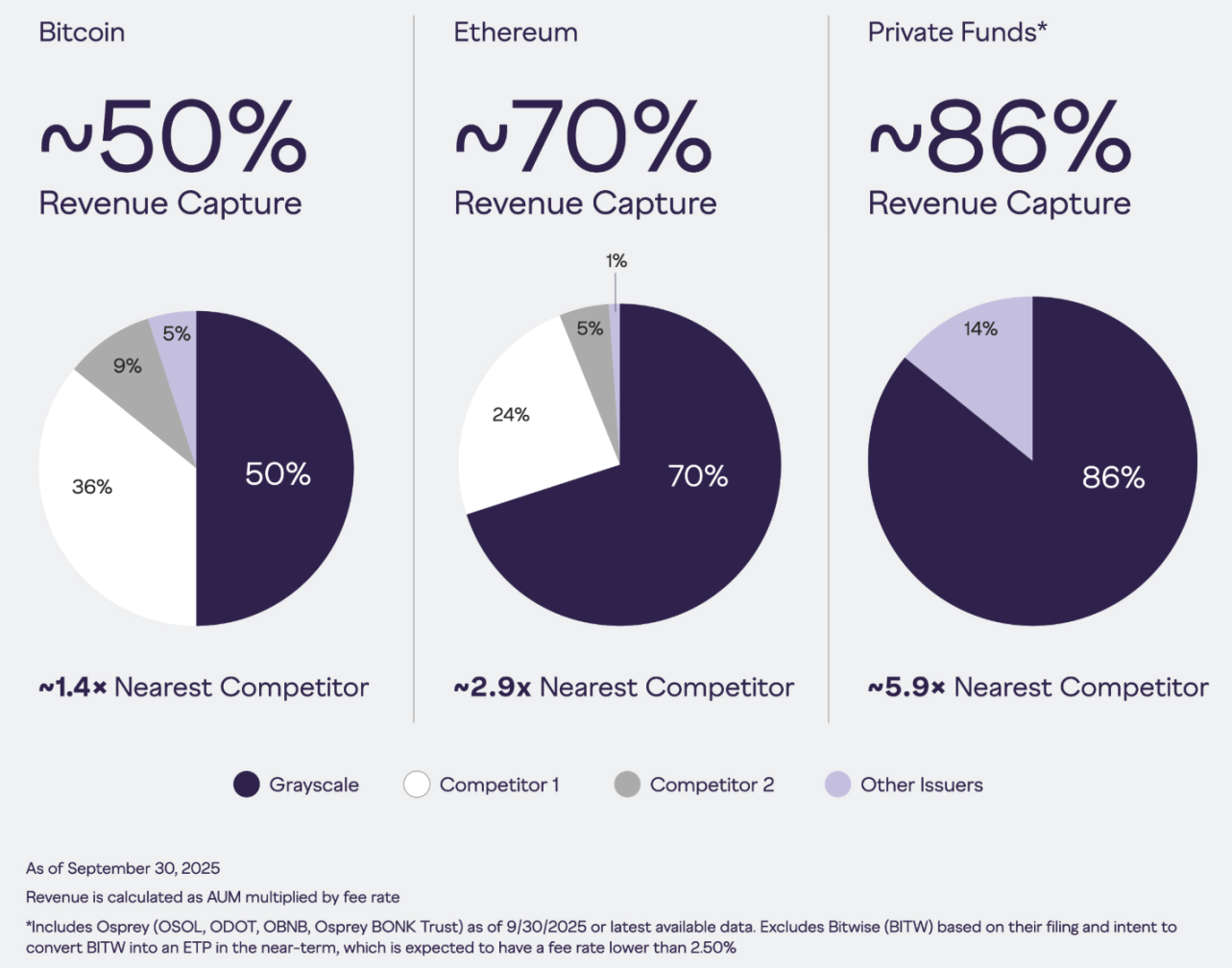 Ngoài ra, chỉ xét về doanh thu, các sản phẩm đầu tư chính của Grayscale có khả năng tạo ra doanh thu mạnh hơn so với các đối thủ cạnh tranh chính, nhưng điều này chủ yếu là do AUM tích lũy từ các quỹ tín thác không thể quy đổi trước đây và phí quản lý cao hơn mức trung bình của ngành.