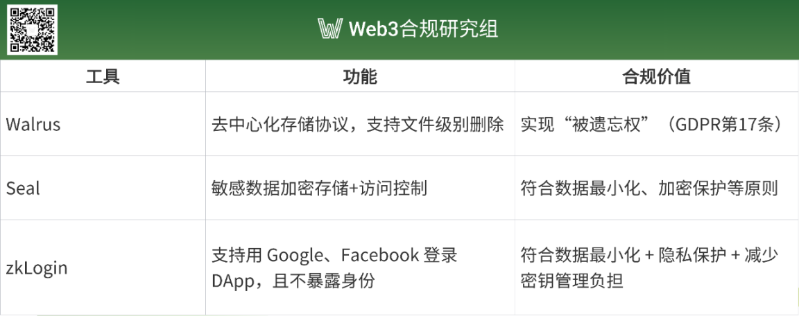 Sui là một trong số rất ít blockchain công khai được xây dựng rõ ràng khả năng tuân thủ GDPR (Quy định Bảo vệ Dữ liệu Chung). Thông qua ba công cụ công nghệ gốc, Sui đã thiết lập một hệ thống tuân thủ cho các thị trường được quản lý chặt chẽ như EU:
