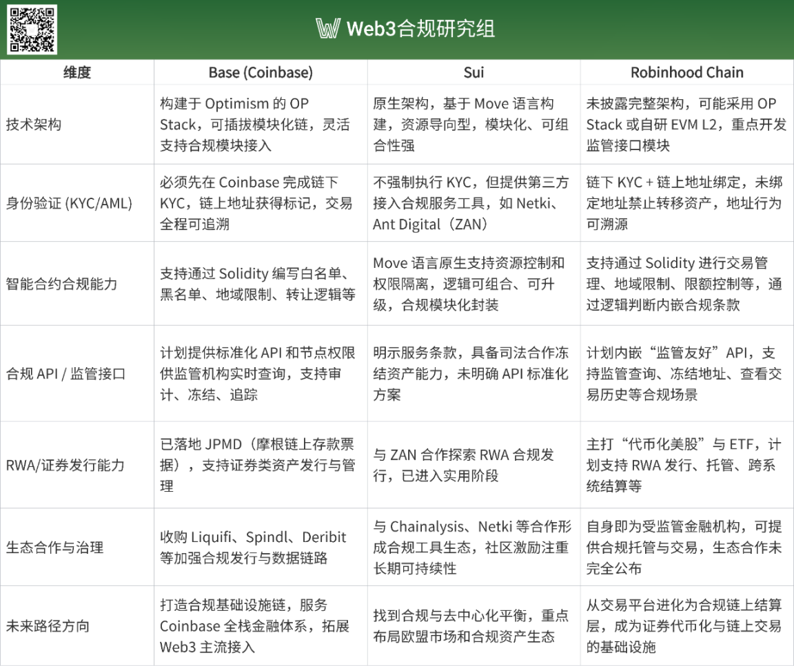Hiện tại, các dự án tiêu biểu đáp ứng định nghĩa của chúng tôi về "chuỗi công khai tuân thủ nghiêm ngặt" bao gồm Base, Sui và Robinhood Chain sắp ra mắt. Hãy cùng xem xét ba dự án này đã đạt được sự tuân thủ như thế nào và họ đã làm được điều đó bằng cách nào.