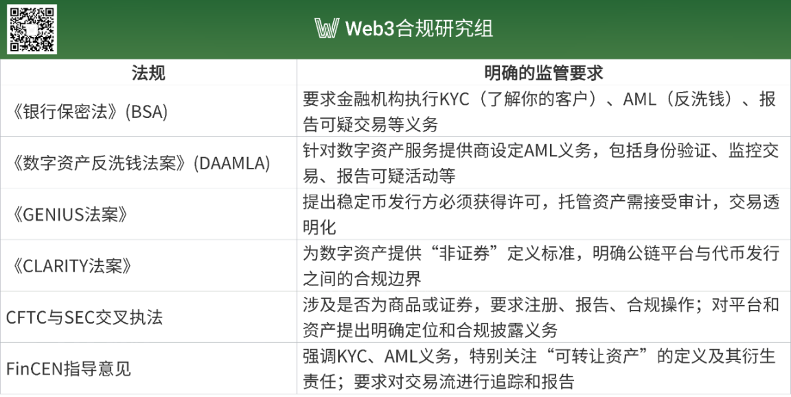Các yêu cầu về quy định chủ yếu đến từ: Đạo luật bảo mật ngân hàng (BSA), Đạo luật chống rửa tiền tài sản kỹ thuật số DAAMLA, Đạo luật GENIUS và Đạo luật CLARITY, việc thực thi chéo của CFTC và SEC, và hướng dẫn của FinCEN.