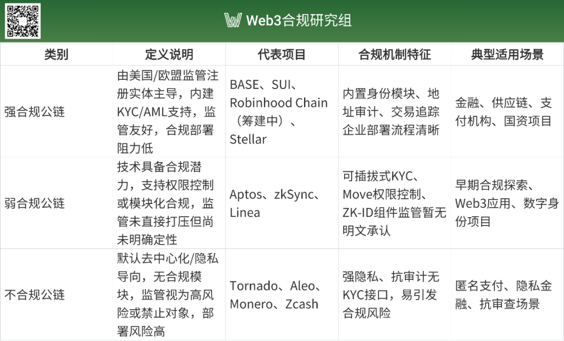 Các chuỗi công khai như Base, Robinhood Chain và Sui được thiết kế với mục tiêu tuân thủ pháp luật, khiến chúng phù hợp để áp dụng trong hệ thống tài chính truyền thống. Tuy nhiên, mặc dù các chuỗi công khai khác, chẳng hạn như ZKsync và Stellar, cũng ưu tiên tuân thủ, chúng vẫn phải đối mặt với tranh cãi về việc chấp nhận quy định, khiến chúng bị xếp vào nhóm "tuân thủ yếu". Hơn nữa, một số chuỗi công khai phải đối mặt với mối quan hệ căng thẳng với các cơ quan quản lý và hoàn toàn không được các tổ chức chính thống chấp nhận.