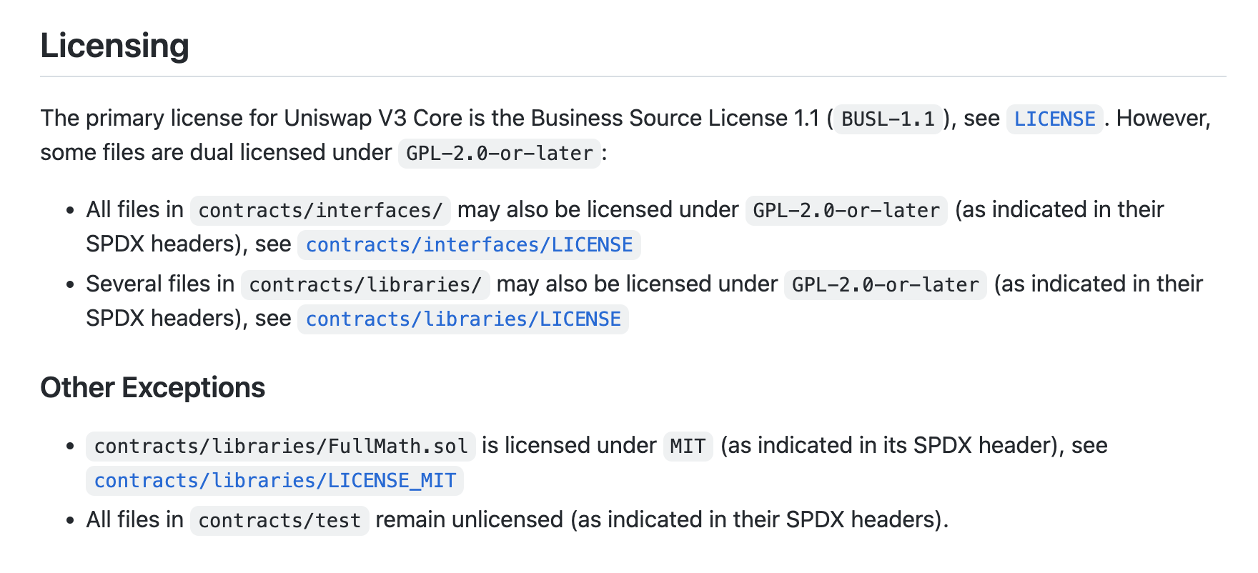 BSL là một loại giấy phép có nghĩa là tồn tại trong một khoảng thời gian xác định trước khi trở thành nguồn mở hoàn toàn. Nói chung, mục đích là để bảo vệ quyền lợi của tác giả từ những sáng tạo của họ. Giấy phép của Uniswap v3 được phát hành vào năm 2021 trong thời hạn hai năm, ngăn mã của nó sử dụng cho mục đích thương mại. Giấy phép mới được gọi là Giấy phép Công cộng Chung áp dụng cho giao thức ngay bây giờ.