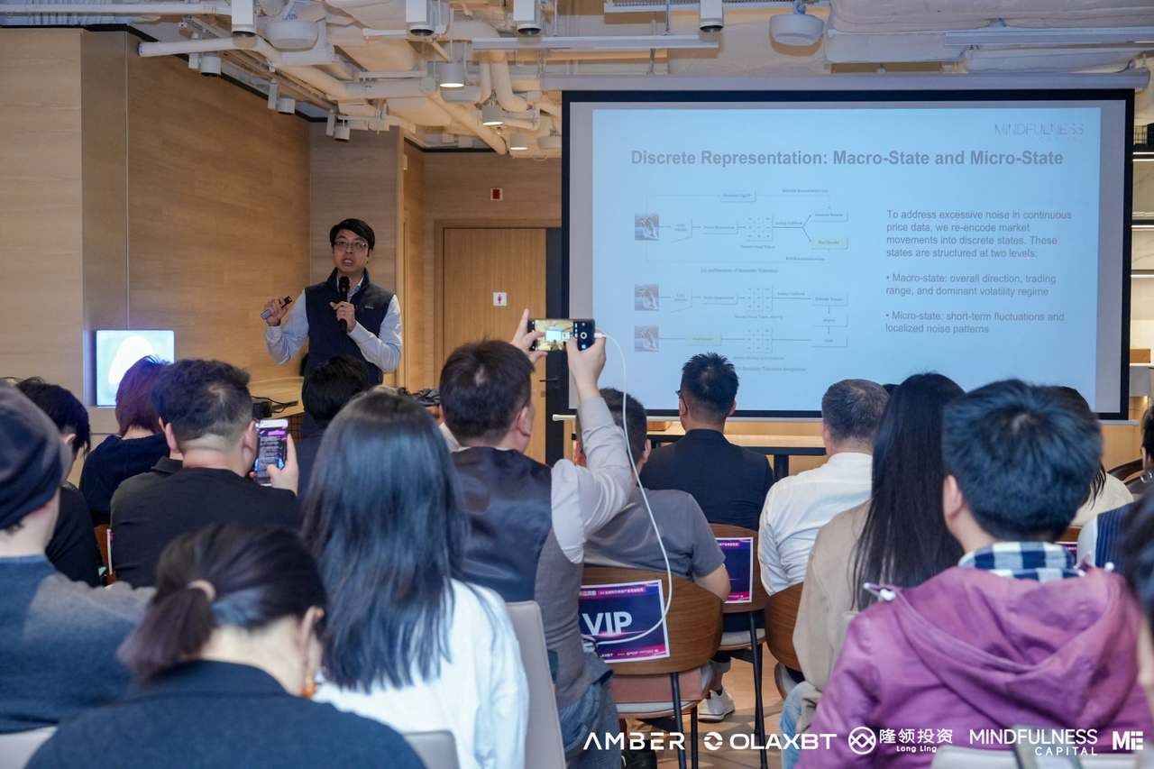 Sau phần thảo luận về tầm nhìn vĩ mô, cuộc trò chuyện chuyển sang các chiến lược và cách triển khai thực tế hơn. Thomas Ao, Đối tác sáng lập của Mindfulness Capital, đã chia sẻ những hiểu biết của mình về "Phân bổ chiến lược định lượng". Ông đã đề xuất một khung phân tích đầy sáng tạo, xem thị trường tiền điện tử đầy biến động như một "hệ thống biểu đạt". Trong khuôn khổ này, nhóm của ông đã phát triển một "mô hình biểu đạt thị trường phân lớp", mã hóa dữ liệu giá liên tục thành một "trạng thái vĩ mô" mô tả xu hướng tổng thể và một "trạng thái vi mô" nắm bắt nhiễu cục bộ, sau đó tái cấu trúc cấu trúc phân lớp này bằng trí tuệ nhân tạo tạo sinh. Mục tiêu của phương pháp này là xuyên qua nhiễu thị trường và thu được một biểu đạt ổn định và dễ hiểu hơn về cấu trúc cơ bản. Trong môi trường được điều khiển bởi AI, điều này cung cấp cho những người ra quyết định một bản đồ rõ ràng hơn về phân bổ chiến lược và nhận thức rủi ro, đạt được sự hợp tác thực sự giữa con người và máy móc cũng như trí tuệ bổ sung cho nhau.