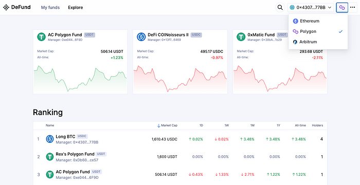 Với việc triển khai giao thức DeFund trên Arbitrum, giờ đây người dùng có thêm một lựa chọn khi trải nghiệm các sản phẩm của DeFund . Ethereum phù hợp hơn với người dùng và nhà quản lý quỹ có khối lượng vốn lớn để hoạt động, trong khi Polygon có khối lượng quỹ tổng thể tương đối nhỏ, nhưng thân thiện hơn với các nhà đầu tư bán lẻ có thể trải nghiệm sản phẩm của chúng tôi với chi phí thấp hơn. Arbitrum có thể giới thiệu nhiều quỹ trực tuyến hơn và vấn đề phí gas cao trước đây đã cản trở người dùng Ethereum đã được giải quyết, cho phép DeFund tiếp nhận nhiều người dùng trực tuyến hơn. DeFund hiện hỗ trợ Ethereum Mainnet, Polygon và Arbitrum. Sau khi kết nối ví của họ, người dùng có thể chọn vận hành tiền trên một mạng nhất định theo sở thích của họ.