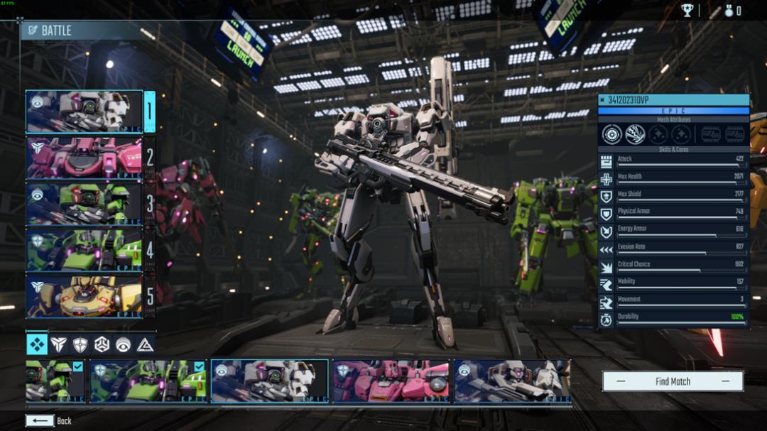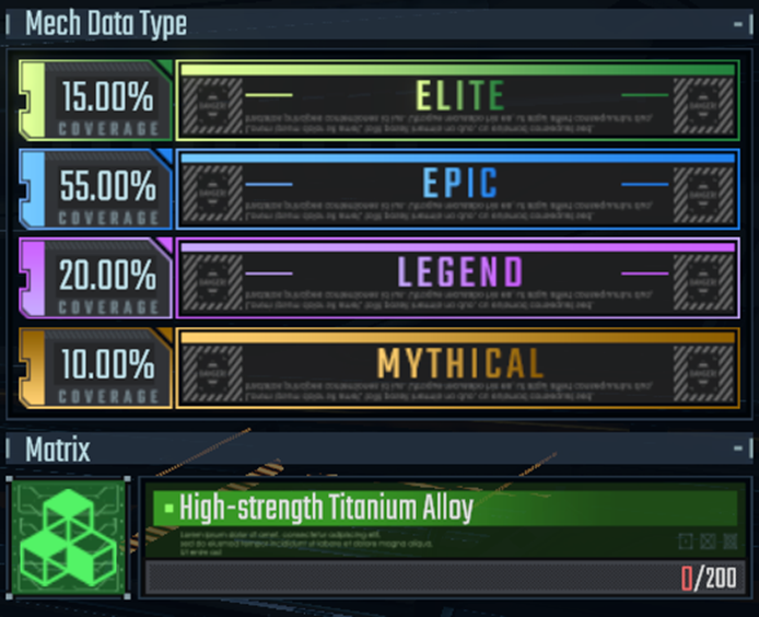 Mecha trong trò chơi được chia thành bốn cấp độ khác nhau: ELITE, EPIC, LEGEND và MYRHICAL. Bốn cấp độ tương ứng với bốn độ hiếm, Huyền bí>Huyền thoại>Sử thi>Ưu tú. Độ hiếm càng cao thì mecha sẽ càng mạnh.