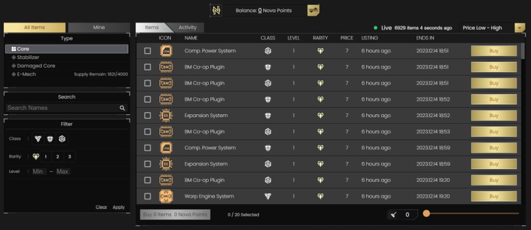 Người dùng có thể mua lõi, bộ ổn định và bản thân cơ khí cần thiết cho cơ khí trong nhà đấu giá. Về cơ bản, đây là một Thị trường NFT hỗ trợ quét sàn chỉ bằng một cú nhấp chuột.