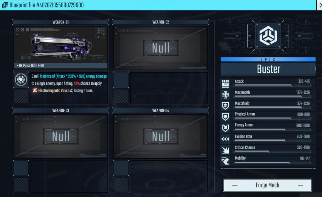 Nhấp vào bản thiết kế để hiển thị các thuộc tính chi tiết và thông tin kỹ năng của máy. Sau đó nhấn vào casting mecha ở góc dưới bên phải để thêm mecha mới vào thư viện.