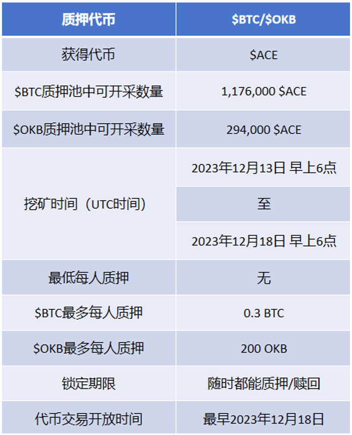 Khai thác OKX Jumpstart sẽ bắt đầu lúc 14:00 ngày 13 tháng 12 năm 2023. Cả chủ sở hữu $BTC và $OKB đều có thể nhận được phần thưởng mã thông báo $ACE bằng cách đặt cọc. Các quy tắc như sau: