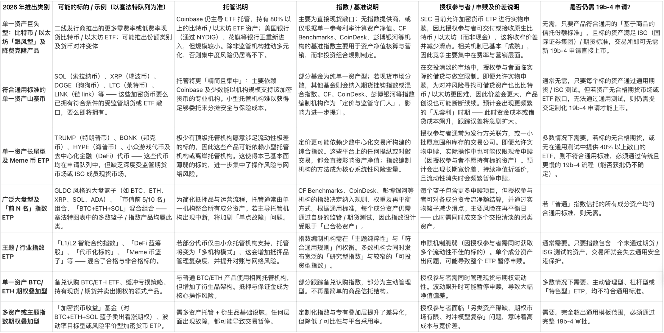 Tiêu chuẩn chung không bao gồm tất cả các loại ETF tiền điện tử — các ETP được quản lý chủ động, có đòn bẩy và "đặc biệt" vẫn yêu cầu các đơn đăng ký 19b-4 riêng biệt (chẳng hạn như ETF có đòn bẩy gấp 2 lần và thiết lập lại hàng ngày, vẫn cần phải trải qua quy trình phê duyệt truyền thống).